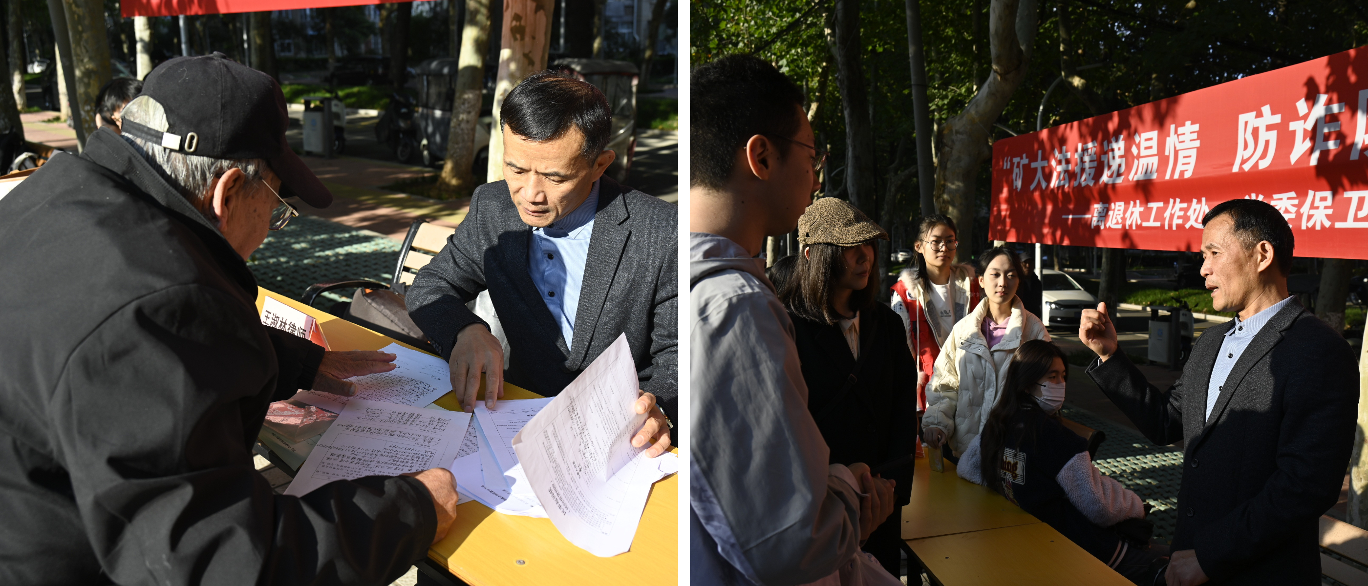 为增强老年人反诈防骗意识,切实维护银龄群体合法权益,营造安全、和谐的养老环境,2025年10月22日下午,离退休工作处联合党委保卫部、法律事务办公室和大学生法律援助中心,在文昌校区南门西12楼前广场成功举办了“矿大法援递温情,防诈防线筑平安”银龄守护行动专项公益活动,为老同志们送上了一份贴心的“平安大礼”。