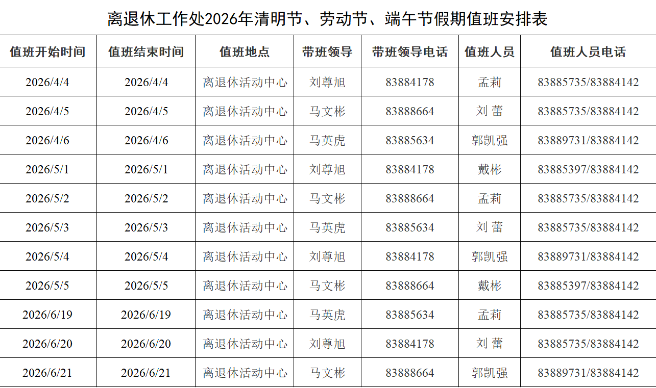 离退休处2026年清明节、劳动节、端午节假期值班安排表